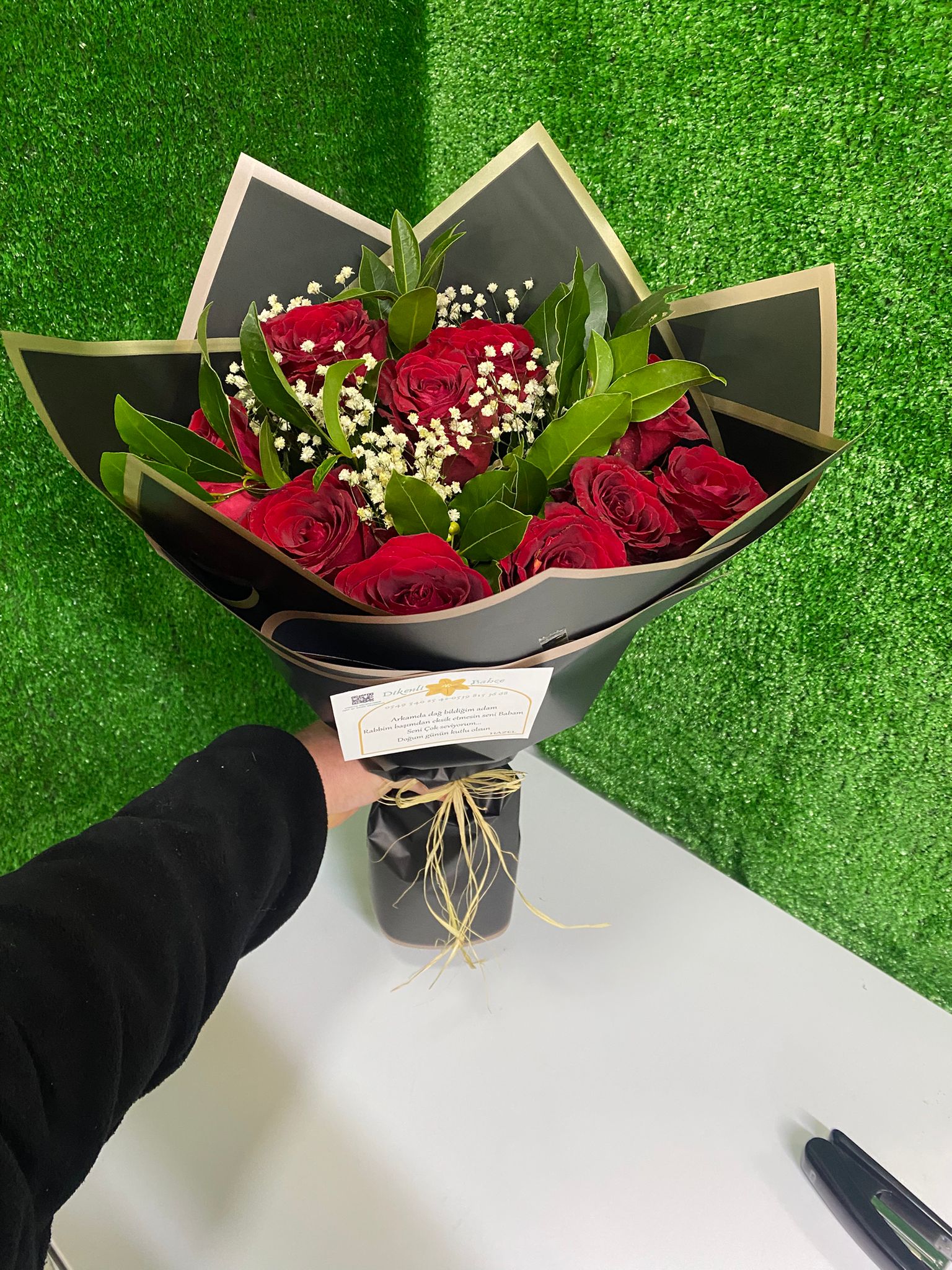 Asil Tutku Kırmızı Gül Buketi; taze ve canlı kırmızı güllerin, cipso (gypsophila) ve özel yeşilliklerle harmanlanarak hazırlanmıştır. Siyah ve gold detaylı modern ambalajı sayesinde hem şık hem de etkileyici bir görünüm sunar.