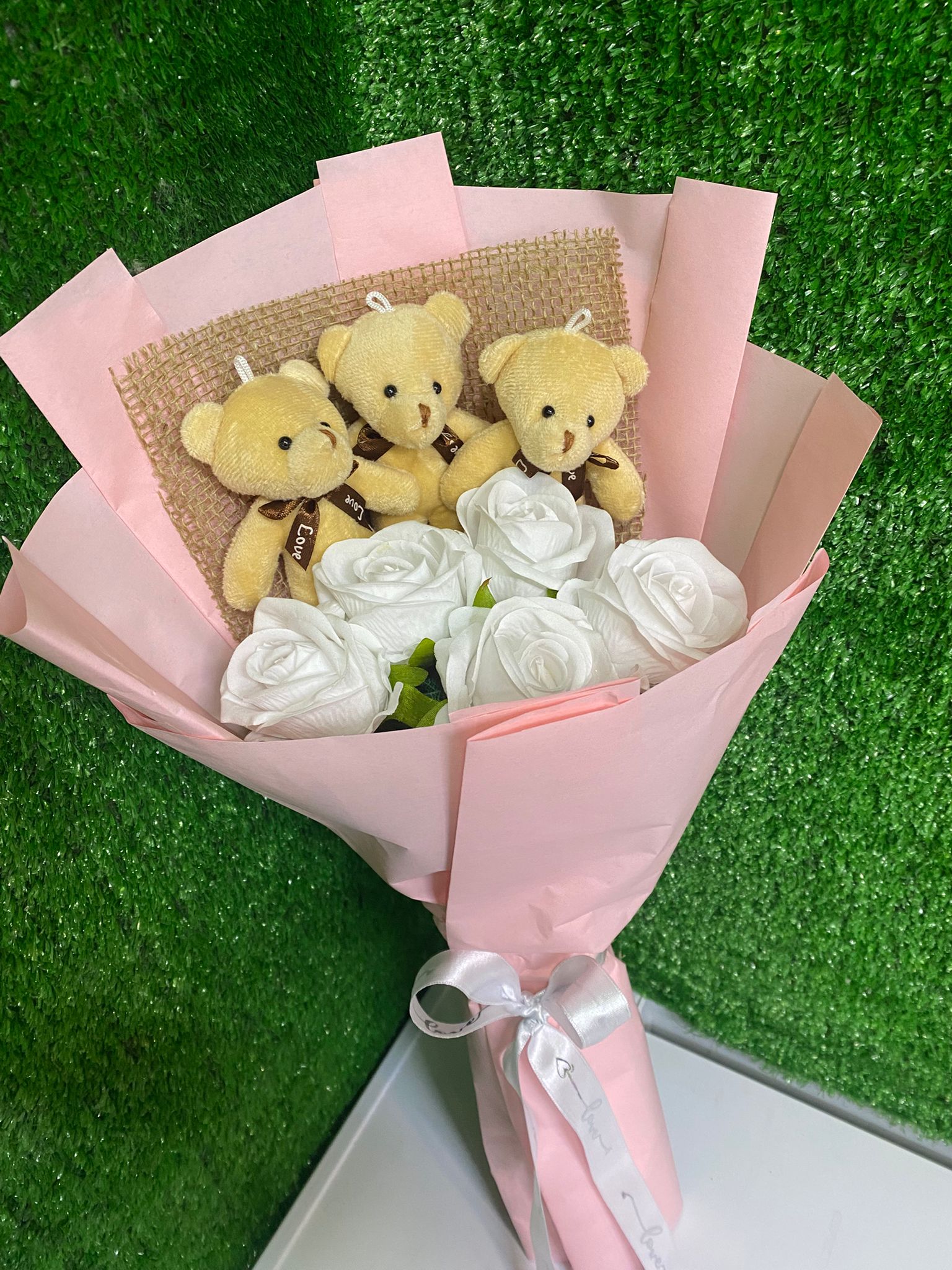 Masumiyetin rengi beyaz güller ile sevimliliğin simgesi ayıcıklar bu özel bukette buluştu.