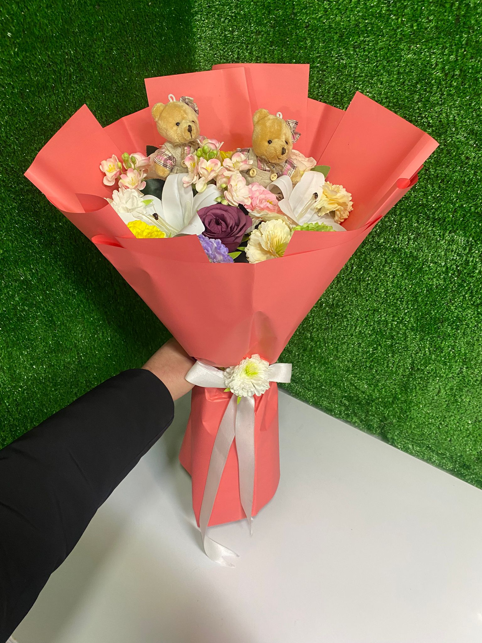 zarif lilyumlar, renkli mevsim çiçekleri ve sevimli peluş ayıcıklarla hazırlanmıştır. Canlı renk uyumu ve şık ambalajı sayesinde doğum günü, yıl dönümü, sevgililer günü, yeni iş, geçmiş olsun ve özel anlar için ideal bir hediyedir.