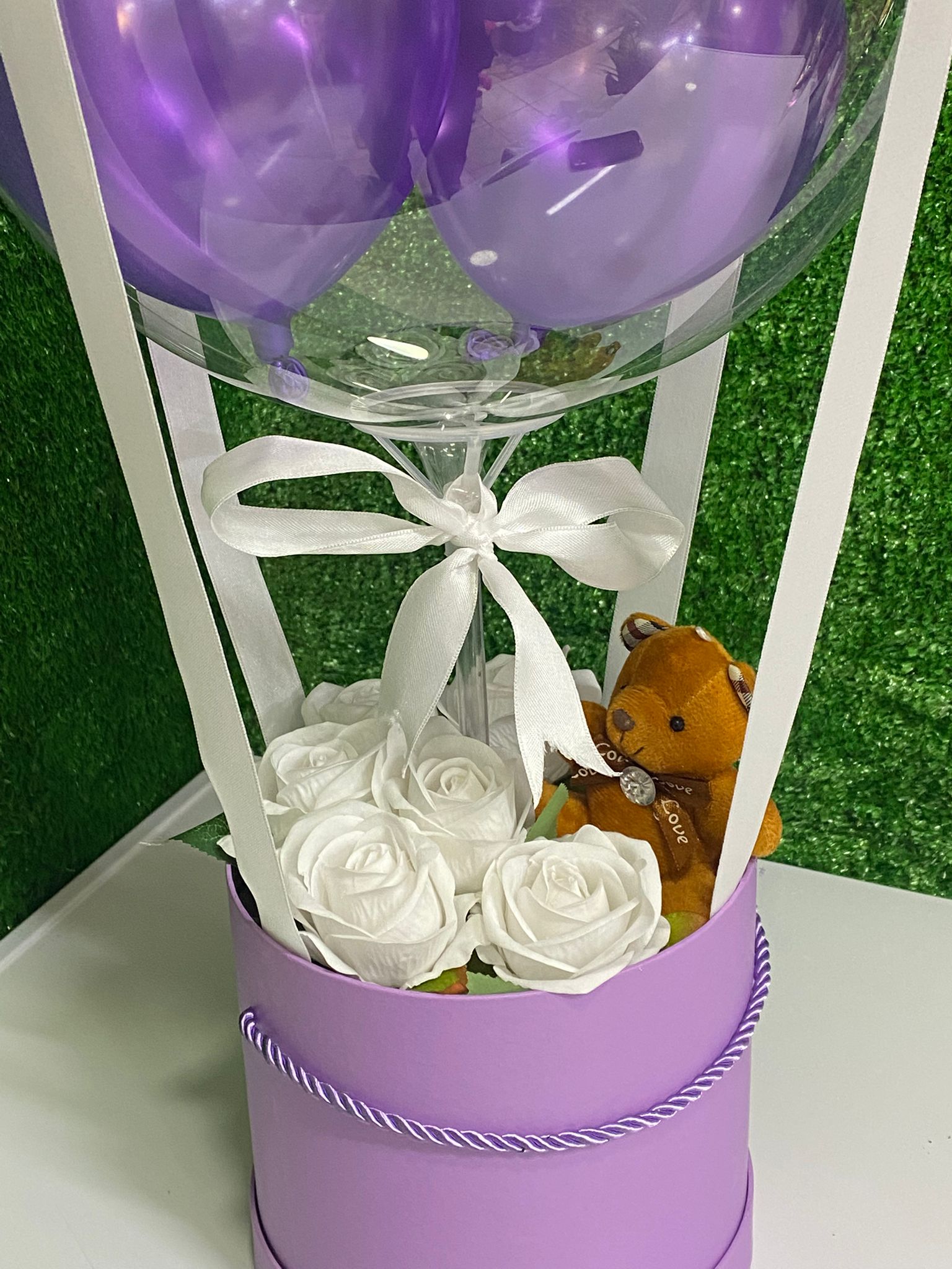Sevdiklerinize hem şık hem de farklı bir hediye sunmak isteyenler için özel olarak tasarlanan bu aranjman; mor konsepti, zarif kutusu ve dikkat çekici balon detayıyla öne çıkar. İçerisinde bulunan beyaz güller, saflığı ve zarafeti simgelerken; sevimli peluş ayıcık hediyeye sıcak bir anlam katar. Üst bölümde yer alan şeffaf balon ve içindeki mor balonlar ise modern ve premium bir görünüm sunar.