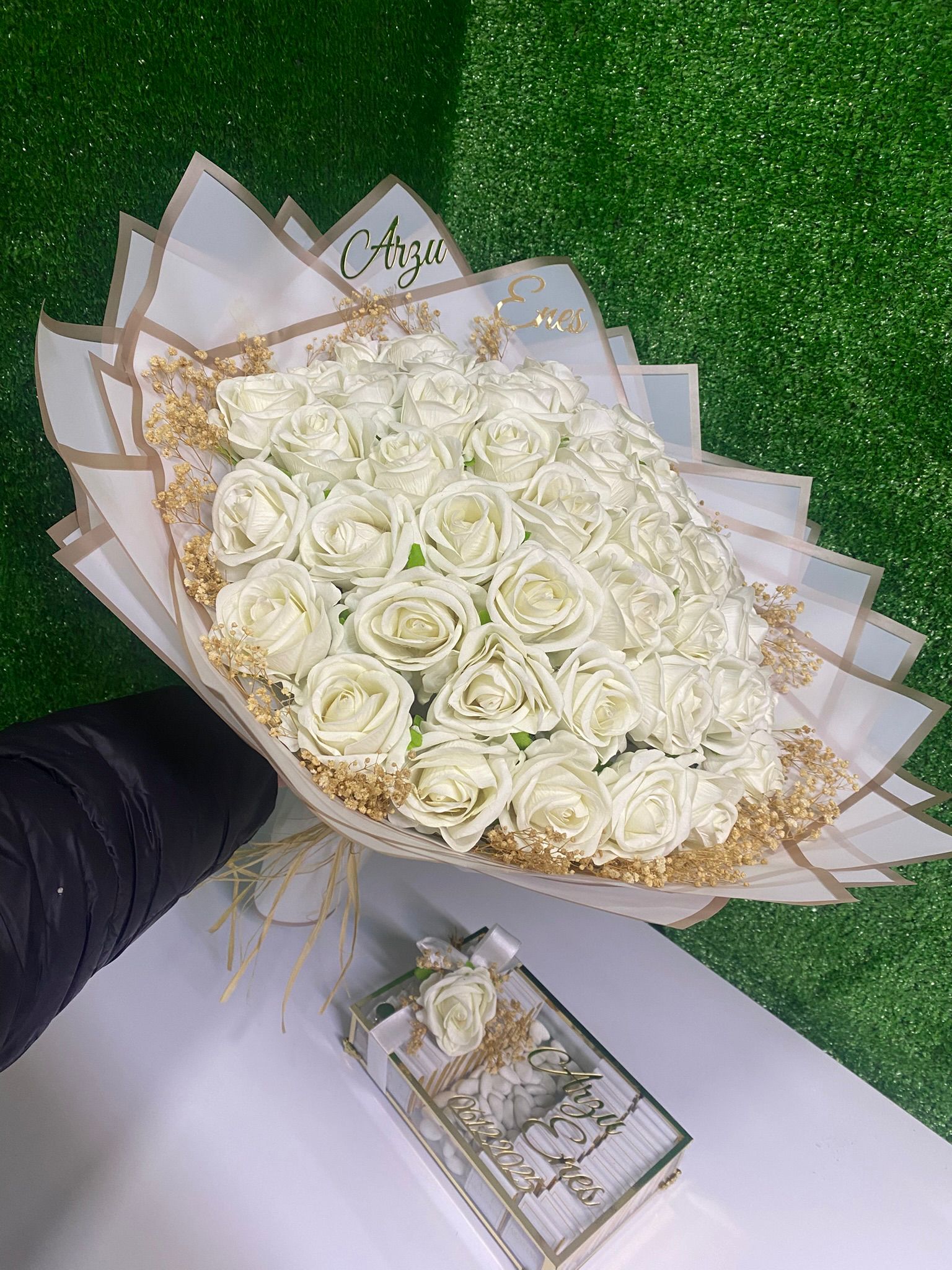 Set içerisinde yer alan yoğun beyaz gül buketi, saflığı ve temiz başlangıçları simgelerken; gold detaylı, isim ve tarih yazılı çikolata kutusu ile kusursuz bir uyum oluşturur.