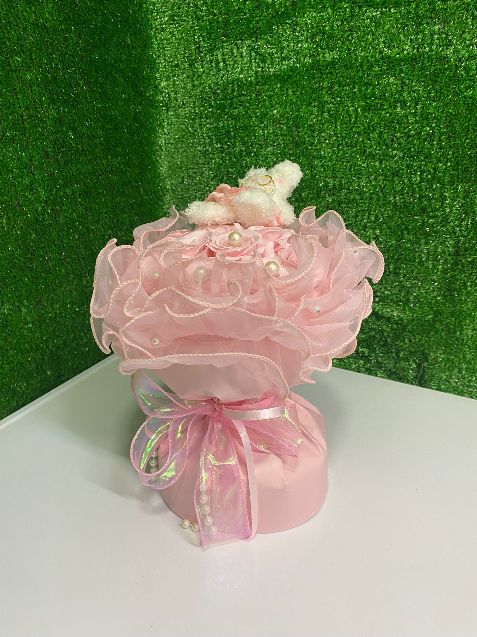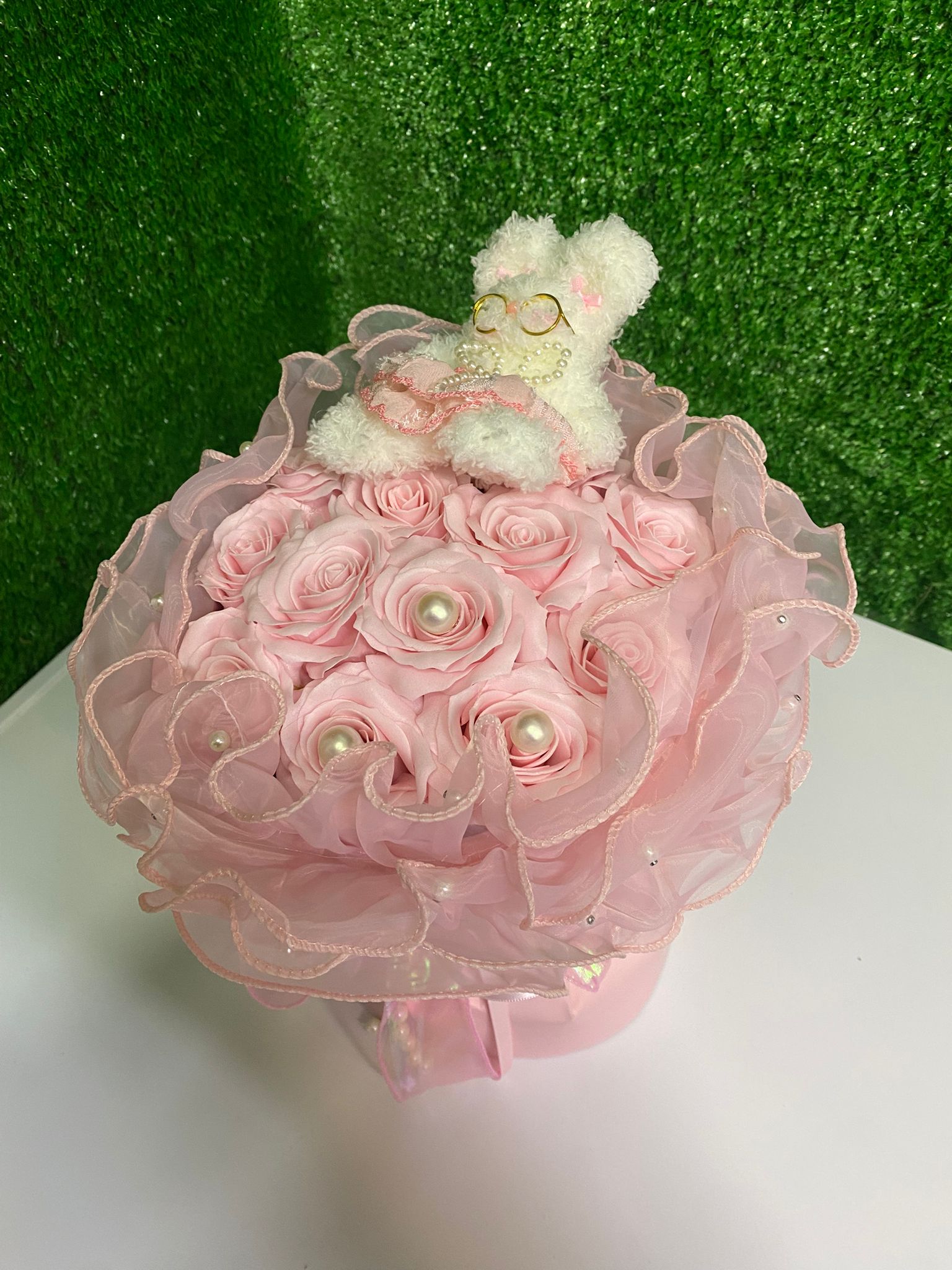 Özel tül çevresi, zarif fiyonk detayı ve pastel pembe kutusu sayesinde göz alıcı bir görünüme sahiptir. Sevgi, zarafet ve mutluluğu tek bir tasarımda buluşturan bu ürün; özellikle romantik ve anlamlı hediyeler arasında öne çıkar.