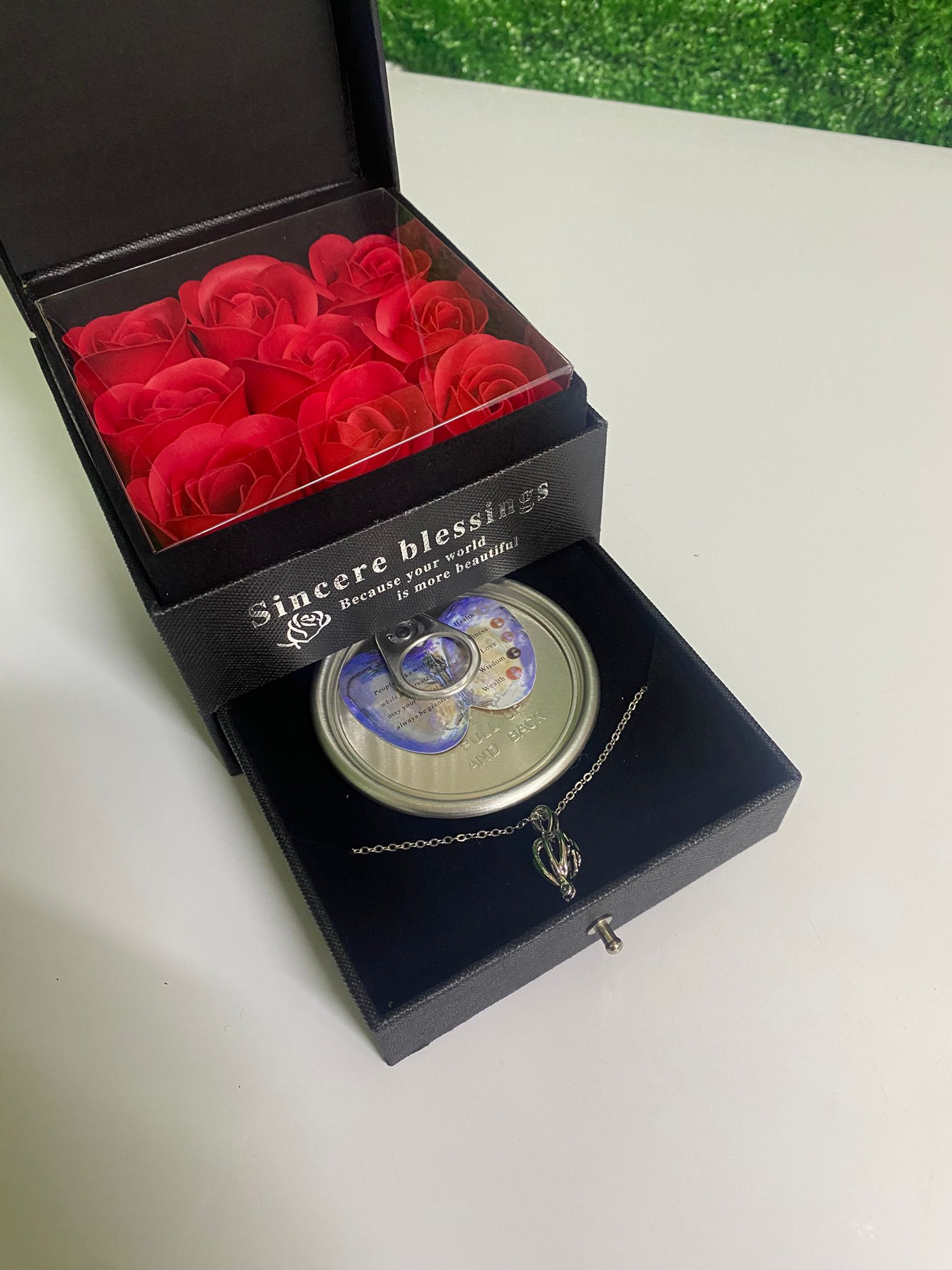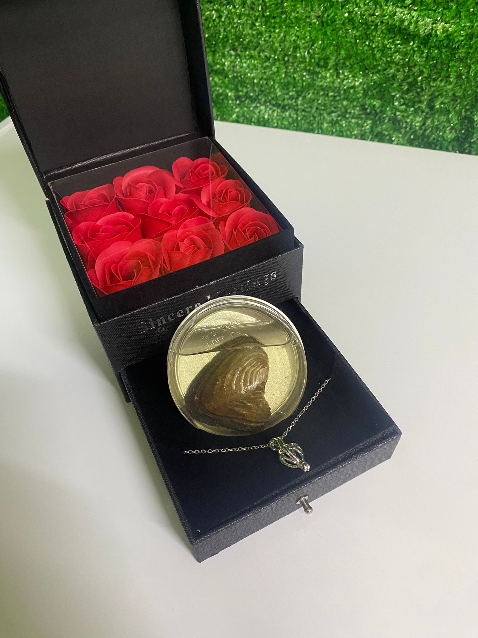 Kutunun üst kısmında yer alan kırmızı güller romantik bir atmosfer sunarken, alt çekmecesinde bulunan gerçek istiridye içerisindeki inci ile hediyeniz çok daha anlamlı hale gelir. İstiridyeyi açarak içinden çıkan inciyi kolyeye yerleştirerek tamamen kişisel bir hediye oluşturabilirsiniz.