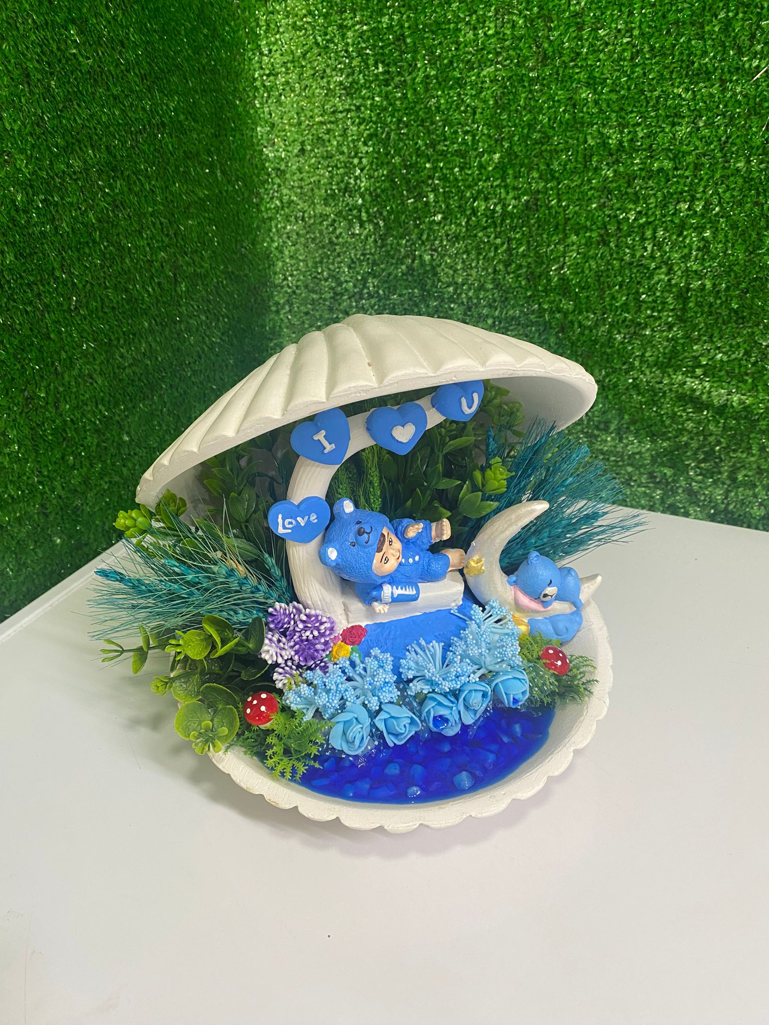 Farklı ve göz alıcı tasarımıyla öne çıkan bu istiridye konseptli bebek aranjmanı, yeni doğan erkek bebekler için hazırlanmış eşsiz bir hediyedir.