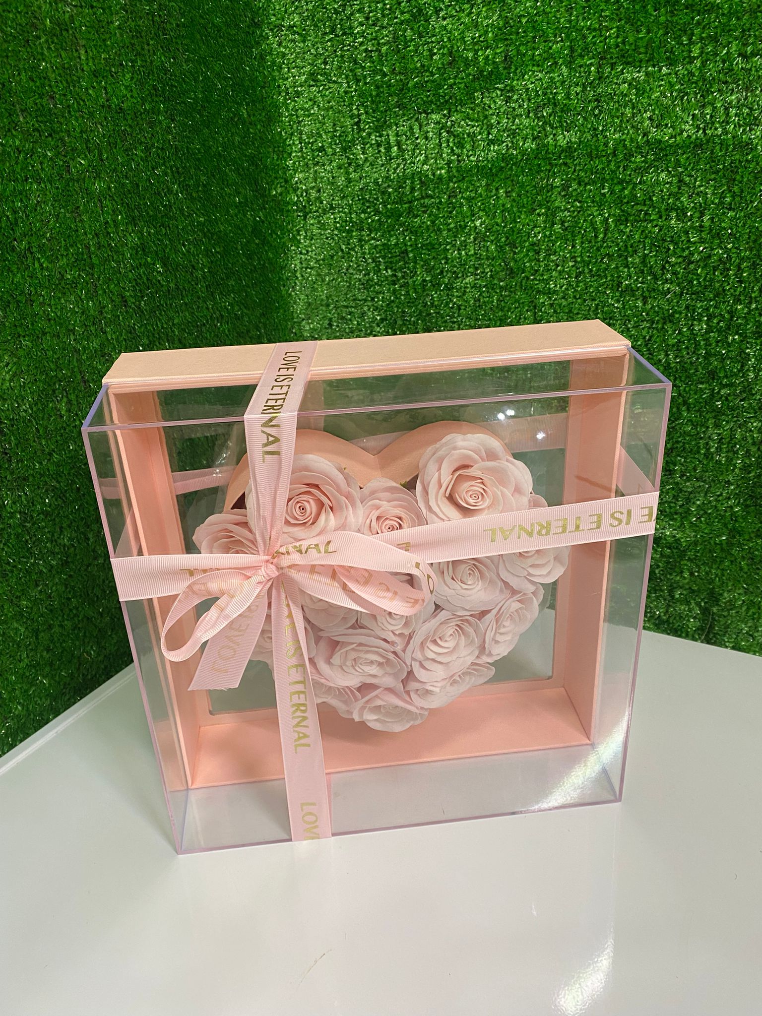 Şeffaf cam kutu içerisinde kalp formunda özenle yerleştirilmiş pudra pembe güller, bu özel tasarım aranjmana romantik, zarif ve soft bir şıklık kazandırır. Açık pembe tonlu iç tasarım ve “Love Is Eternal” yazılı kurdele detayı ürünü lüks ve estetik bir hediye haline getirir.