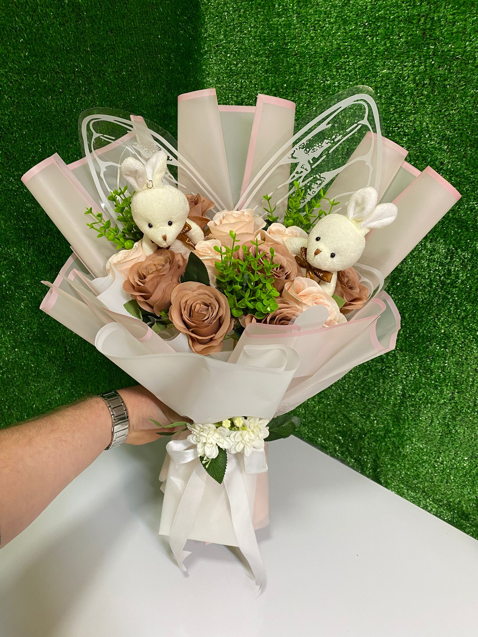 Karamel Bunny Elegance, karamel tonlarındaki güller, yeşil dokular ve iki sevimli tavşan figürüyle hazırlanmış özel bir hediye buketidir. Soft beyaz ambalajı ve zarif kurdelesiyle hem tatlı hem de şık bir görünüm sunar.