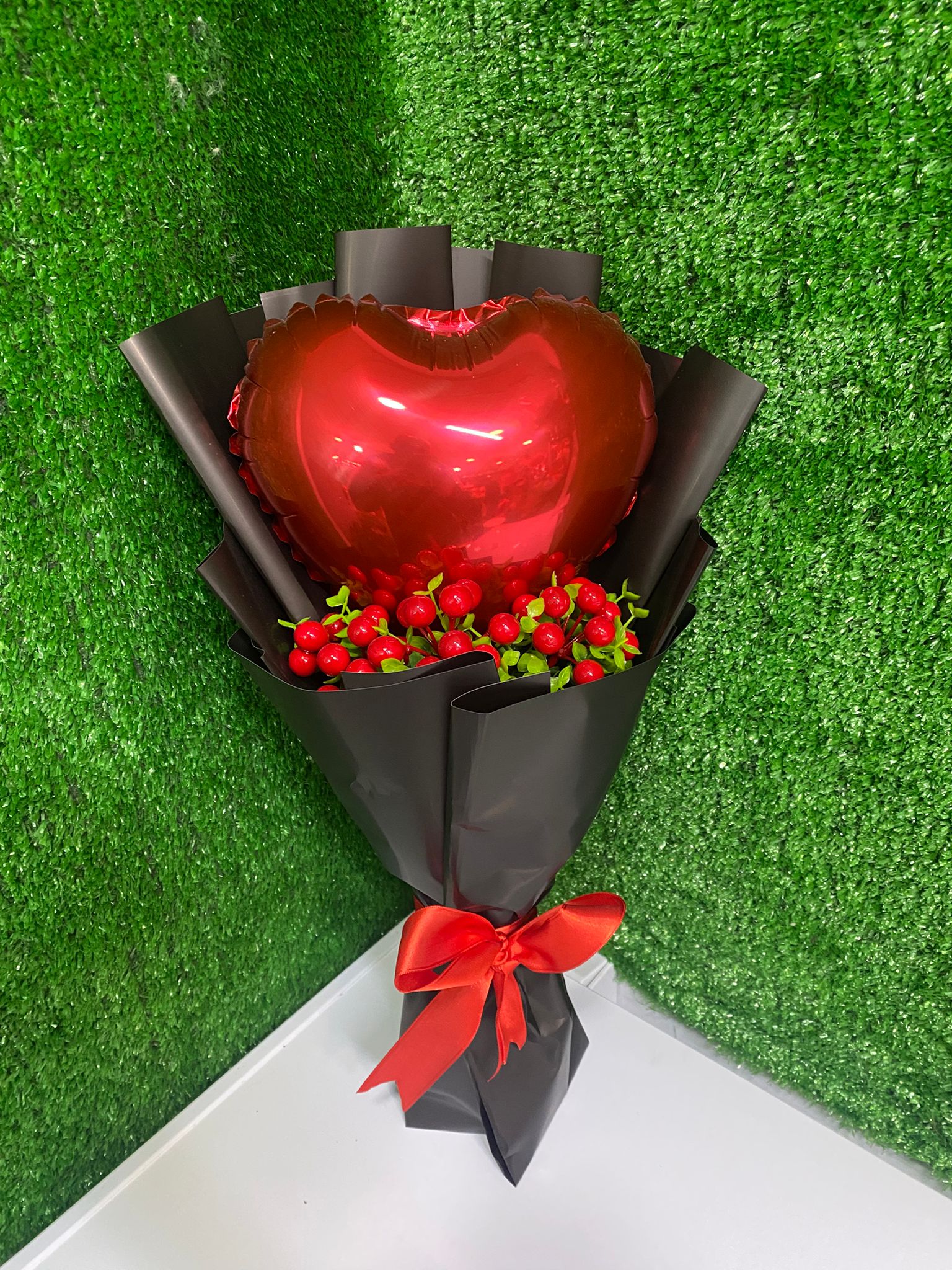 Kırmızı Aşk Mini Kalp Buketi; kırmızı folyo kalp balonunun parlak ve romantik enerjisini, canlı kırmızı yılbaşı meyveleriyle birleştirerek hazırlanan özel bir tasarımdır.