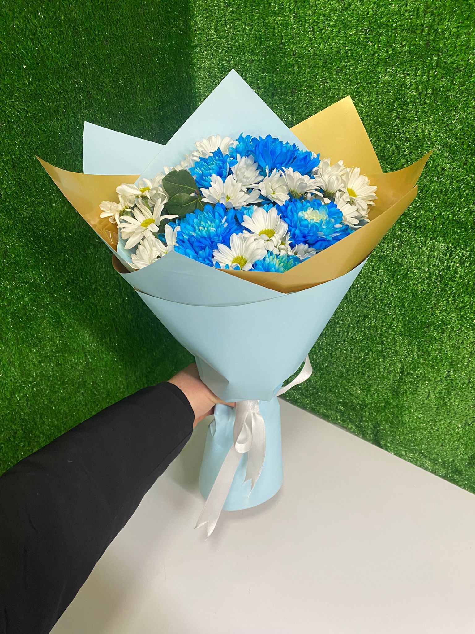 Mavi tonlardaki krizantemler ile beyaz papatyaların uyumuyla hazırlanan bu özel buket, ferahlık ve zarafeti bir arada sunar. Açık mavi ve hardal tonlu ambalajı ile modern ve dikkat çekici bir görünüm kazanırken, beyaz kurdele detayı tasarıma şıklık katar.