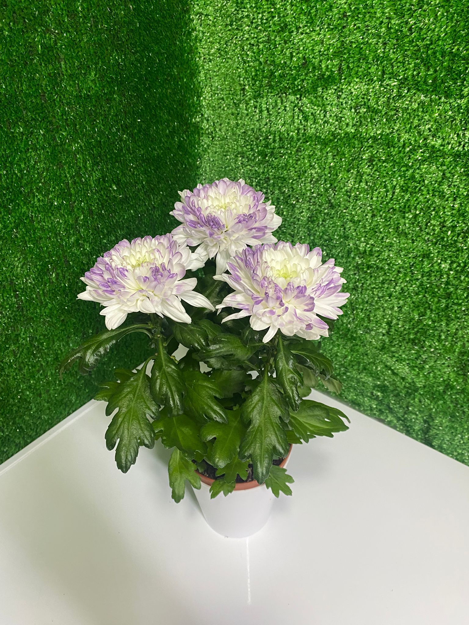 Beyazın saflığı ve morun zarif dokunuşunu bir araya getiren bu krizantem saksı çiçeği, bulunduğu ortama huzur ve şıklık katar. Dolgun çiçek yapısı ve canlı yeşil yapraklarıyla hem dekoratif hem de uzun ömürlü bir bitkidir.
