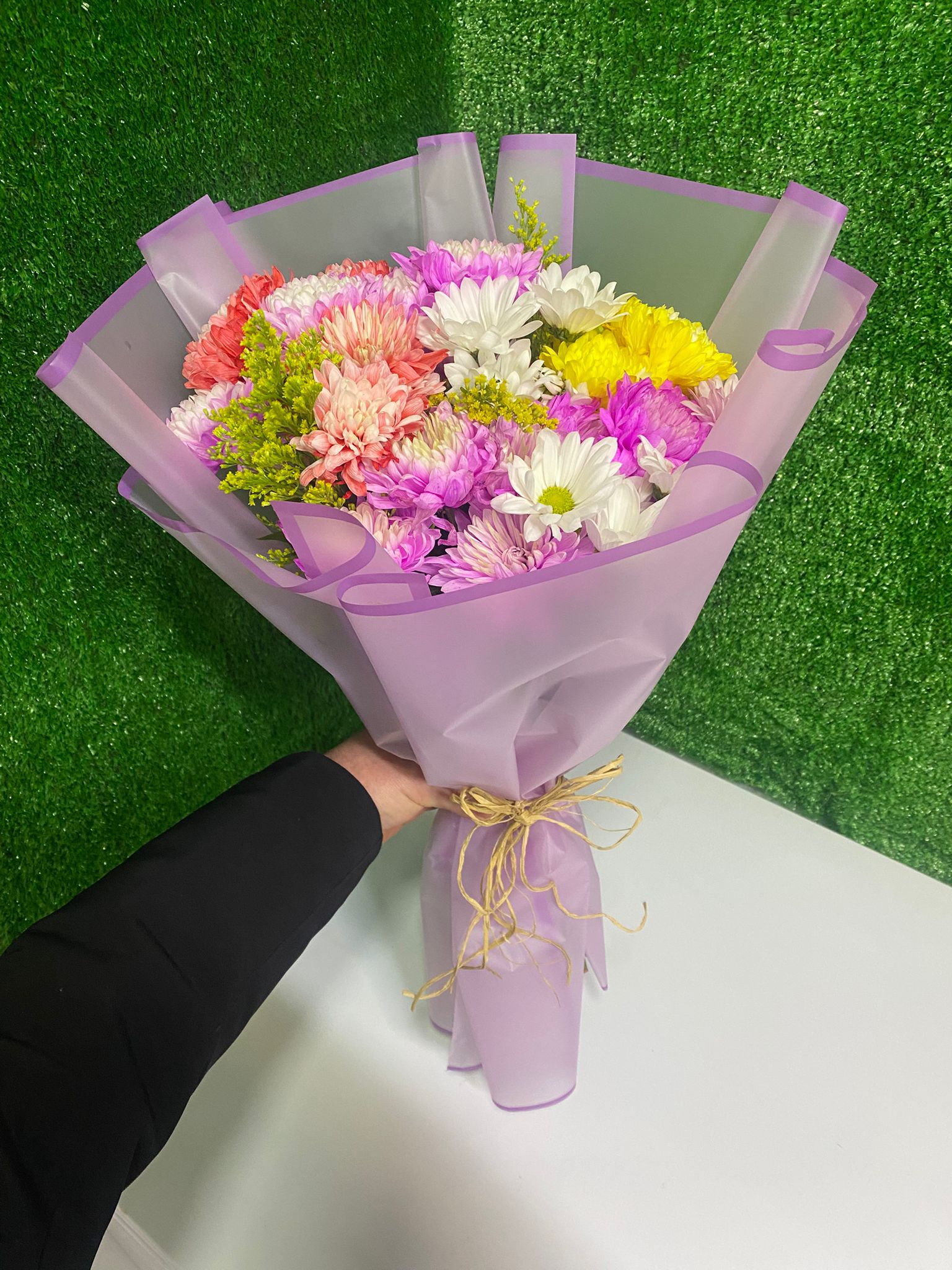 Mor tonlu şık ambalajı ve rengârenk papatya çeşitleriyle hazırlanan bu özel buket, enerjisi ve zarafetiyle her ortama mutluluk katar. Doğum günü, geçmiş olsun, teşekkür, yeni iş tebriği veya içinizden gelen bir sürpriz için ideal bir tercihtir. Uzun ömürlü çiçekleri ve doğal görünümüyle sevdiklerinize hem şık hem de anlamlı bir hediye sunar.