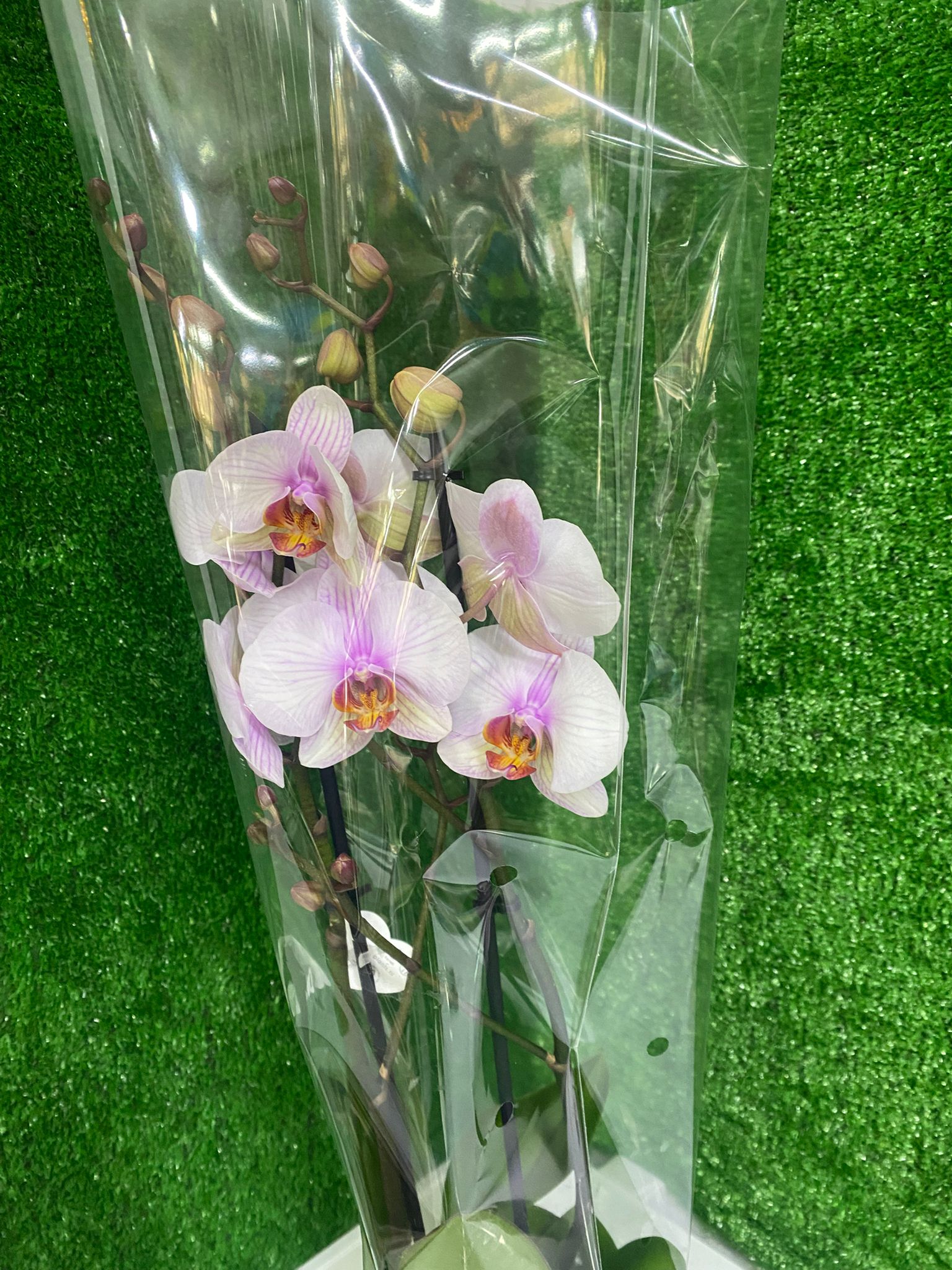 Pembe ve beyazın en zarif uyumunu yansıtan bu çift dallı Phalaenopsis orkide, bulunduğu ortama şıklık ve ferahlık katar. Modern beyaz saksısı ve koruyucu ambalajı ile hem hediye hem de dekoratif kullanım için ideal bir seçenektir.