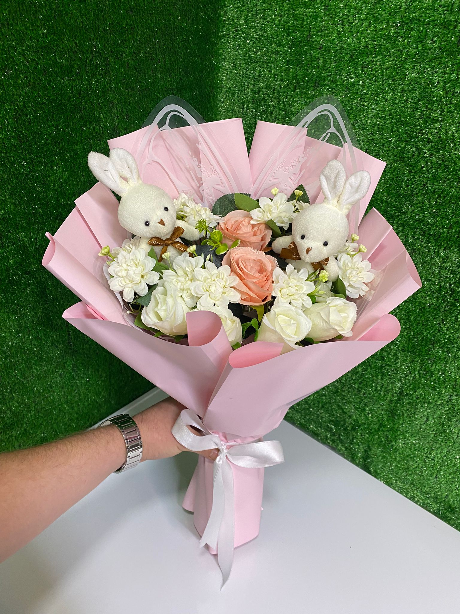 “Pembe Bunny Masalı”, sevimli tavşancıklar ve pastel çiçeklerle hazırlanmış tatlı bir hediye buketidir. Doğum günü, yeni doğum ve özel sürprizler için ideal bir seçimdir.