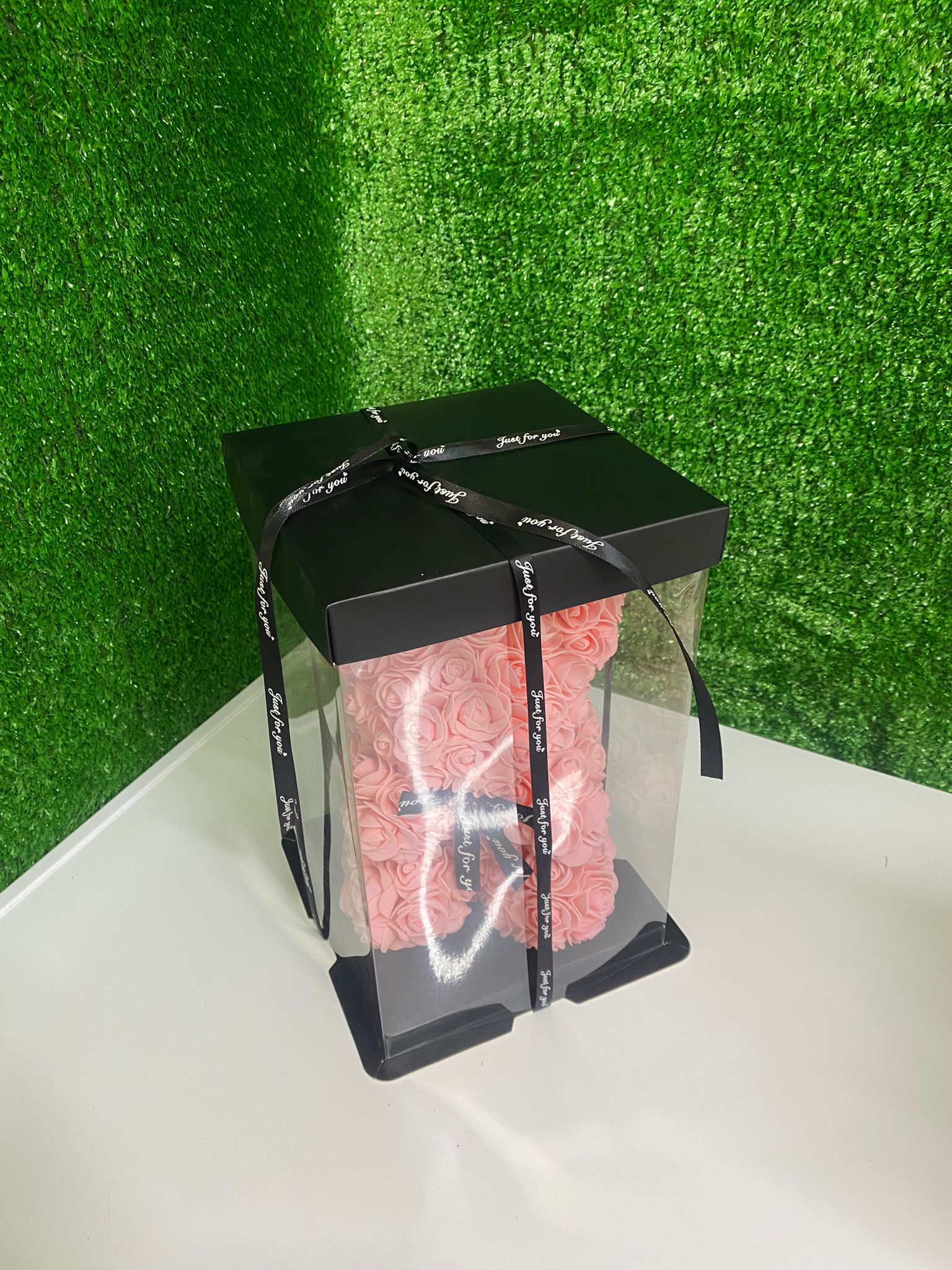 Sevginizi en özel şekilde ifade etmenin en zarif yolu! Pembe gül detaylarıyla hazırlanan bu özel ayıcık, şeffaf lüks kutusu ve şık siyah kurdele tasarımıyla göz alıcı bir hediye sunar.