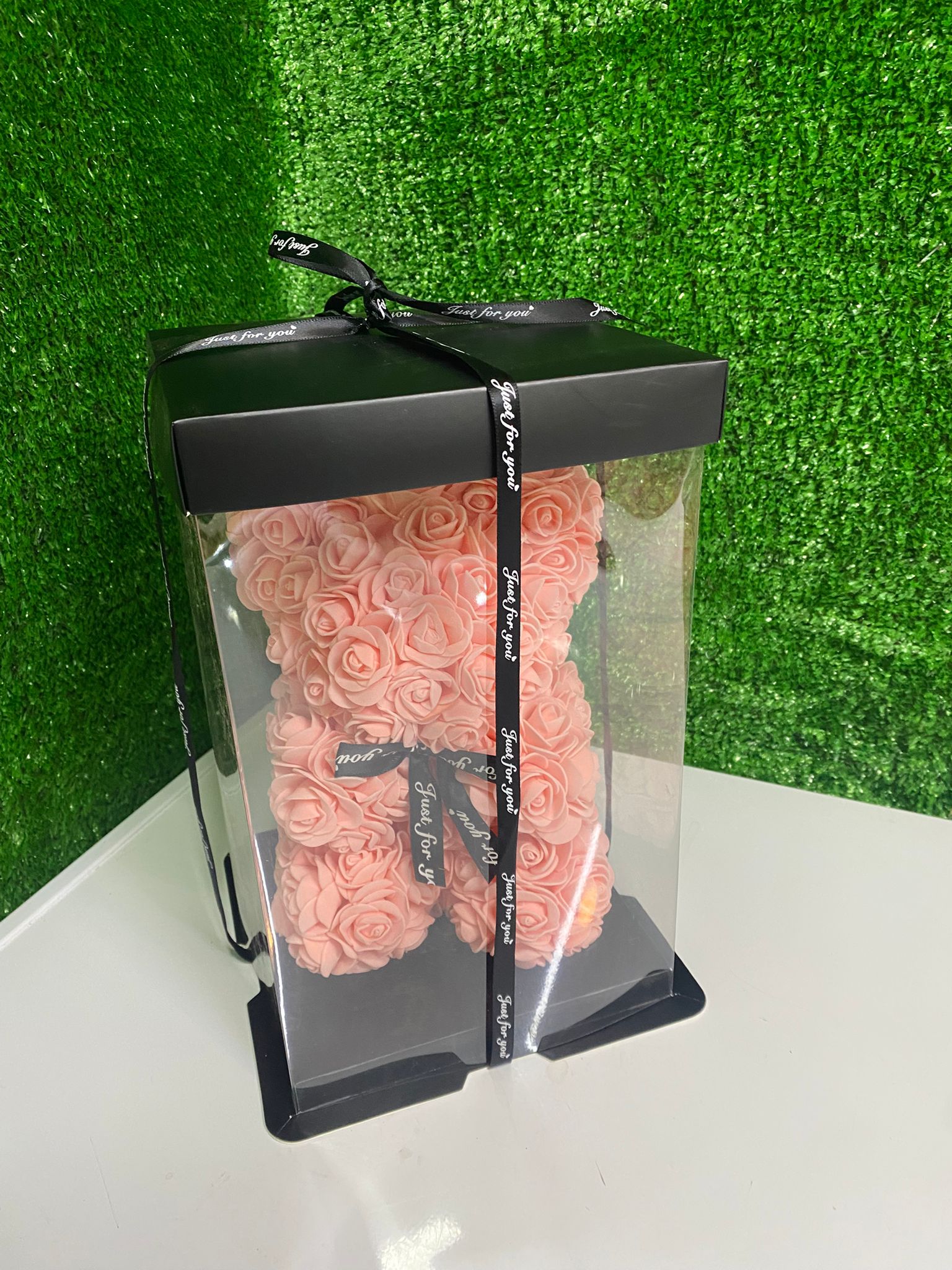 Pembe tonlarında özel tasarım yapay güllerden oluşan bu zarif ayıcık, şeffaf lüks kutusu ve şık siyah kurdelesiyle birlikte sunulmaktadır. Gerçek gül görünümündeki kalıcı güller sayesinde uzun yıllar bozulmadan saklanabilir.