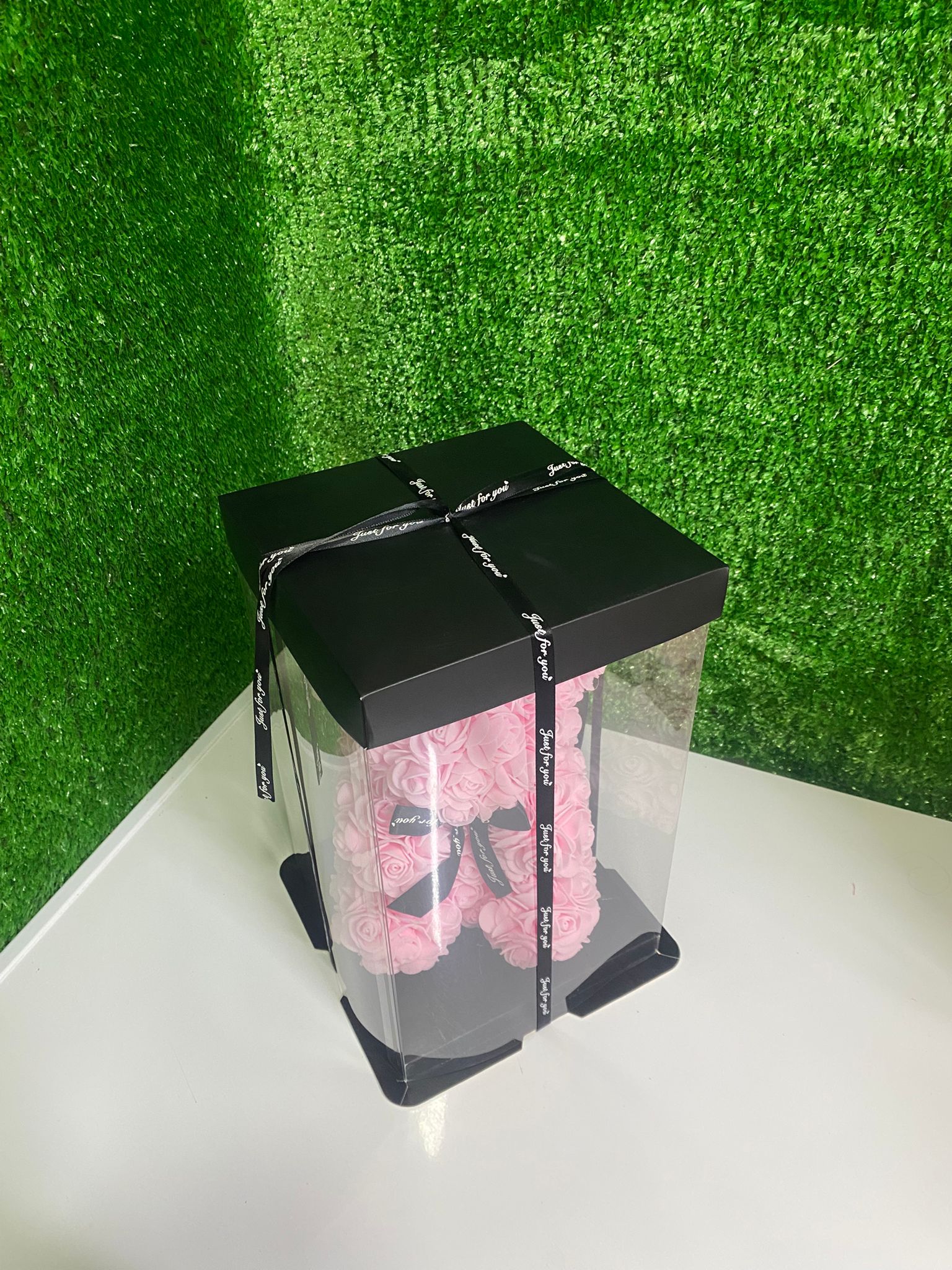 Romantik ve zarif bir hediye arayanlar için mükemmel bir seçim! Pembe gül detaylarıyla hazırlanan bu özel ayıcık, şeffaf lüks kutusu ve şık siyah kurdele tasarımıyla göz kamaştırır.