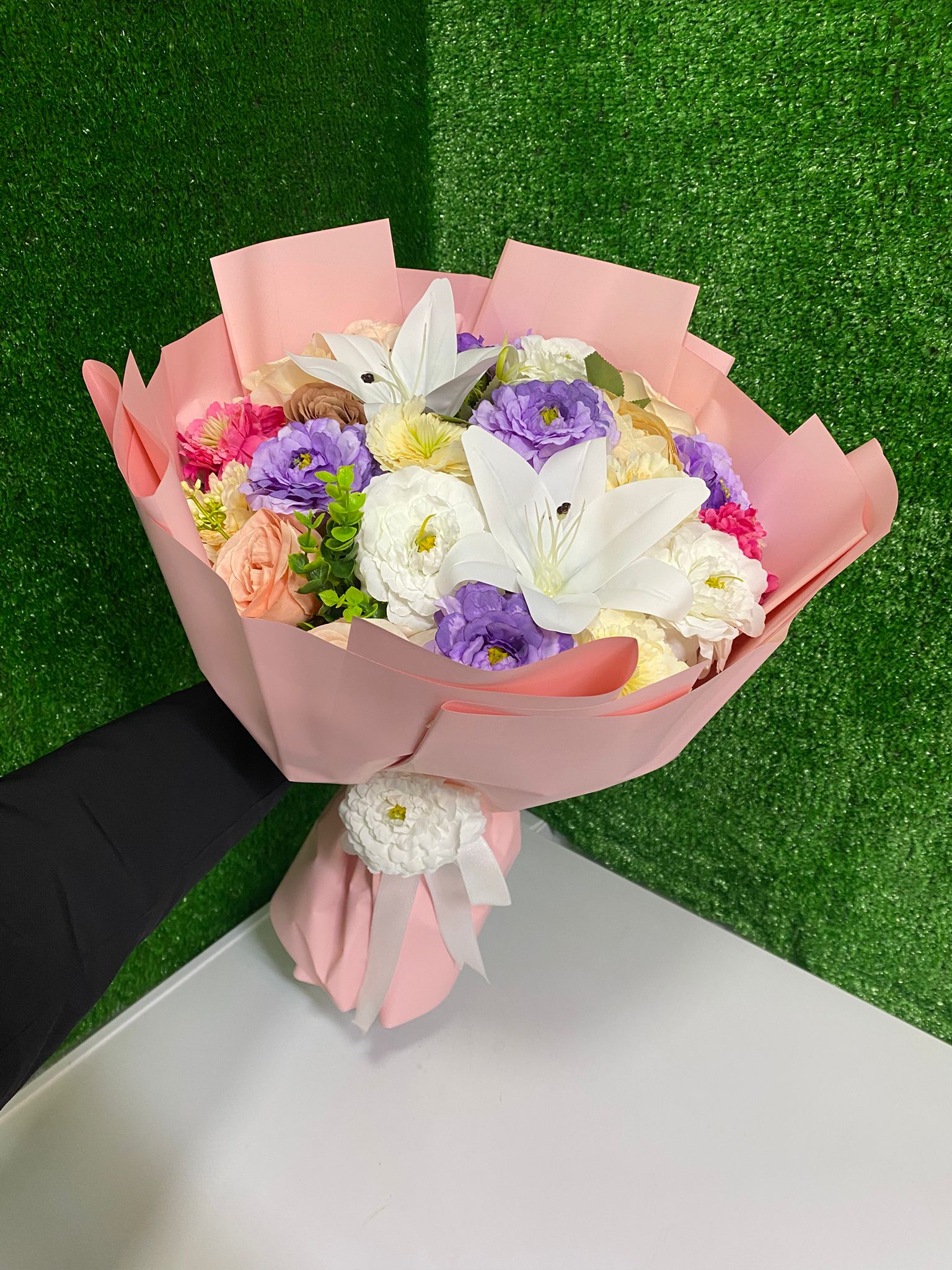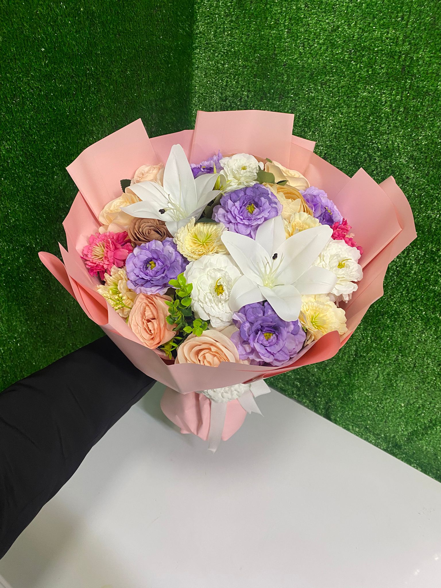 Pembe Zarafet Lilyum Buketi; beyaz lilyumların asaleti, mor lisyantusların romantik dokunuşu ve pastel tonlardaki özel çiçeklerle hazırlanmış, göz alıcı ve zarif bir aranjmandır.