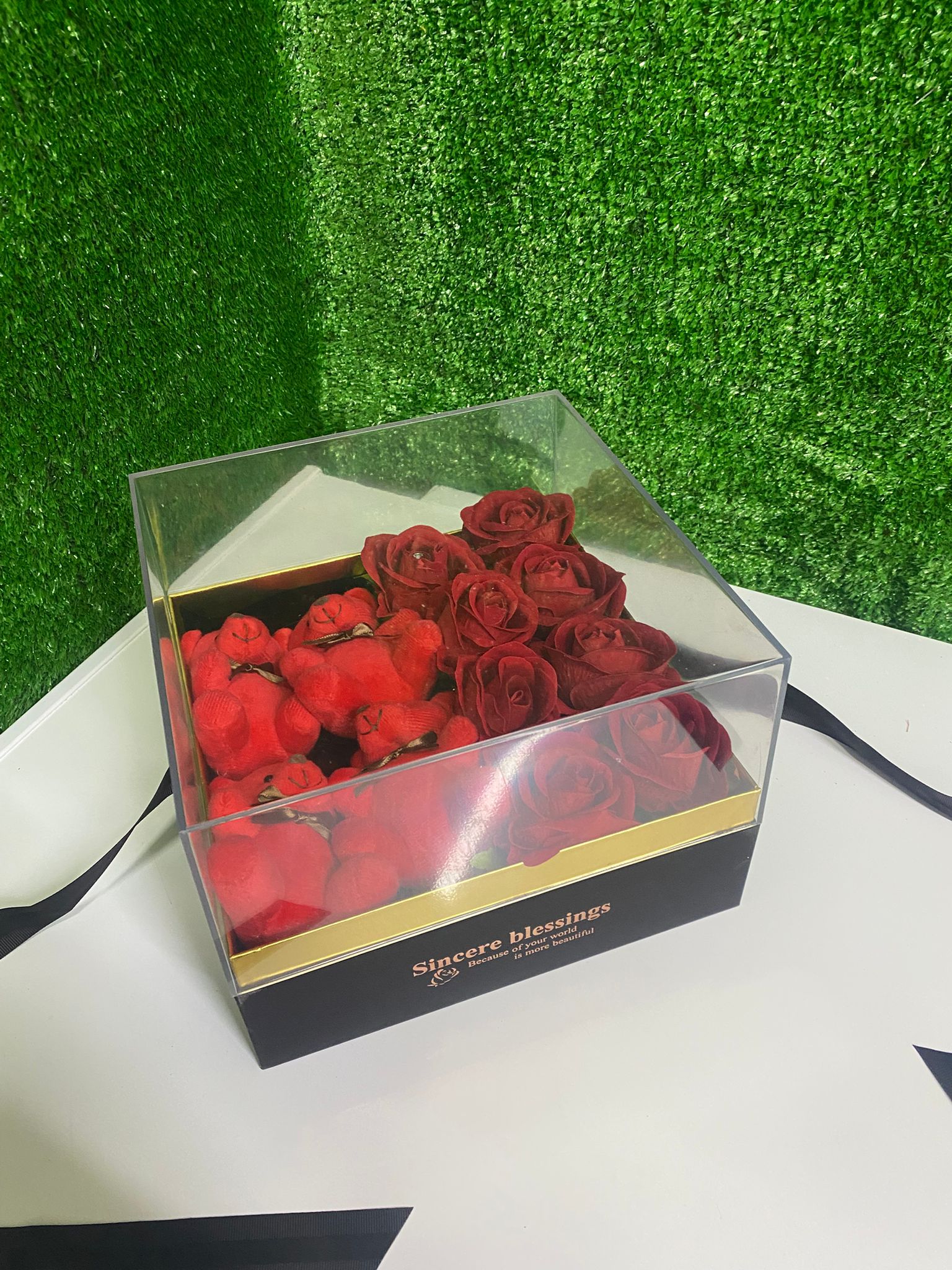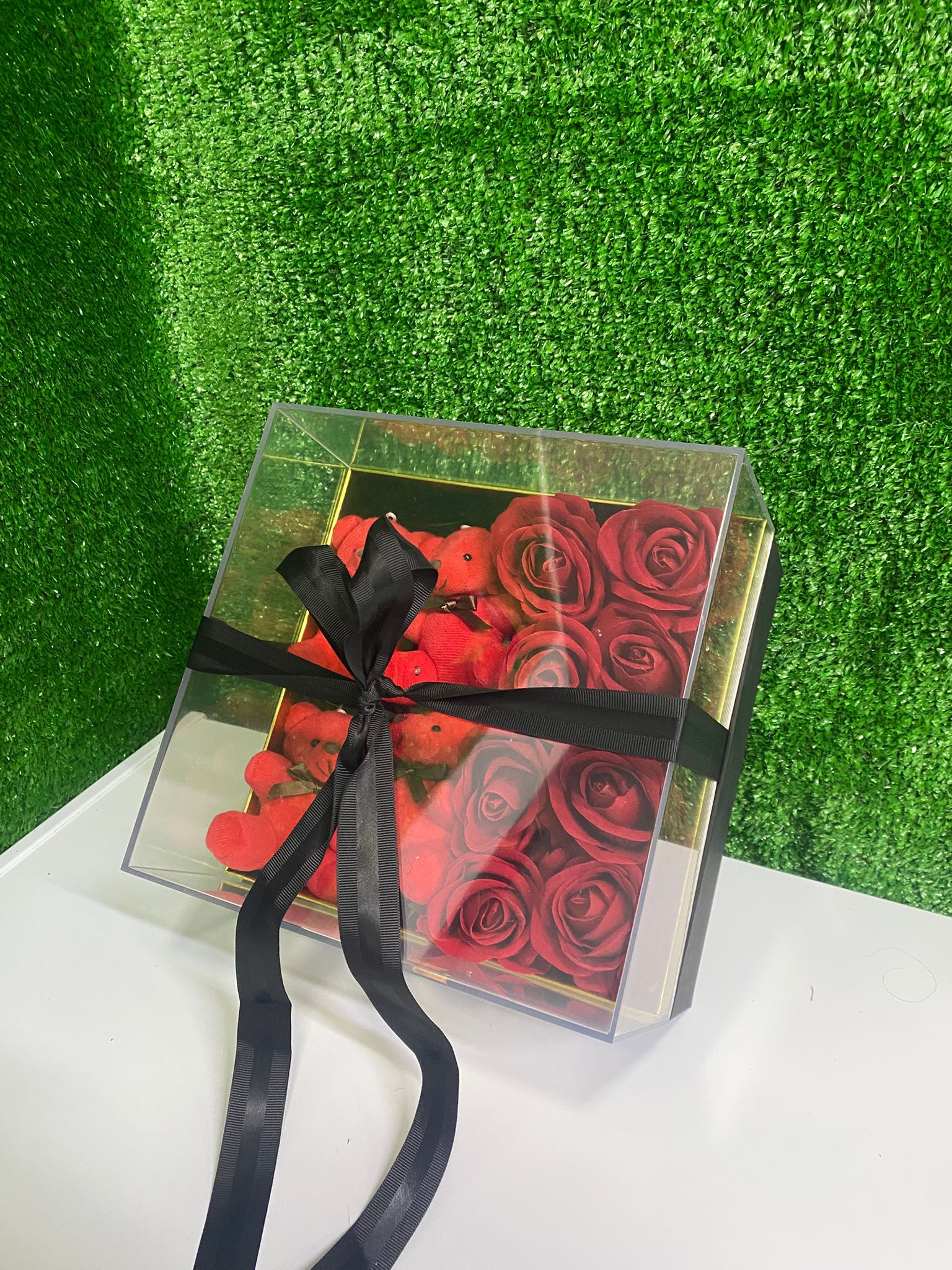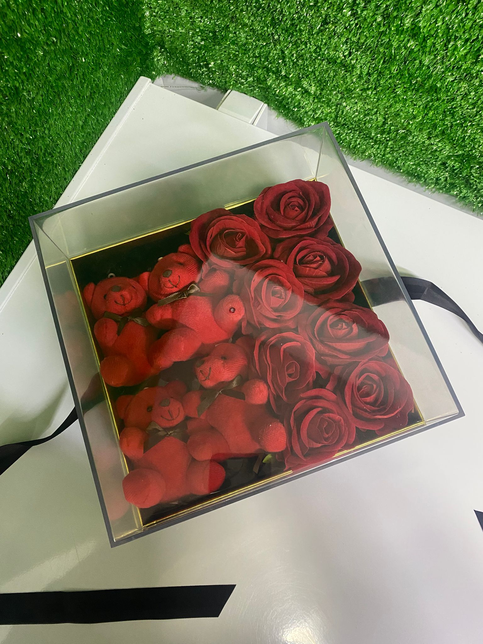 Sevginizi özel ve şık bir şekilde ifade etmek isteyenler için hazırlanan bu premium kutu, kırmızı güller ve mini peluş ayıcıklarla tasarlanmıştır. Şeffaf kapaklı modern kutu tasarımı sayesinde hem zarif hem de dikkat çekici bir hediye sunar.