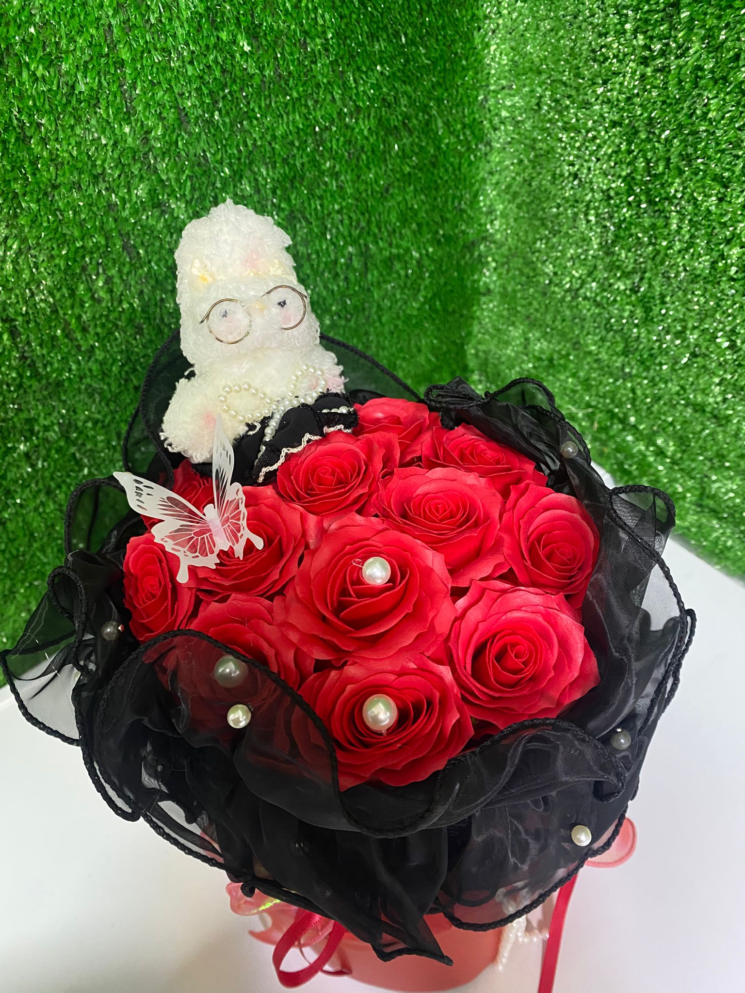 Siyah Tüllü Ayıcıklı Kırmızı Gül Kutusu; aşkın ve tutkunun simgesi kırmızı güllerin, zarif siyah tül detaylarla buluştuğu özel bir tasarımdır. İnci süslemeler, dekoratif kelebek figürü ve üst kısmındaki ayıcık dokunuşu ürüne hem romantik hem de zarif bir karakter kazandırır.