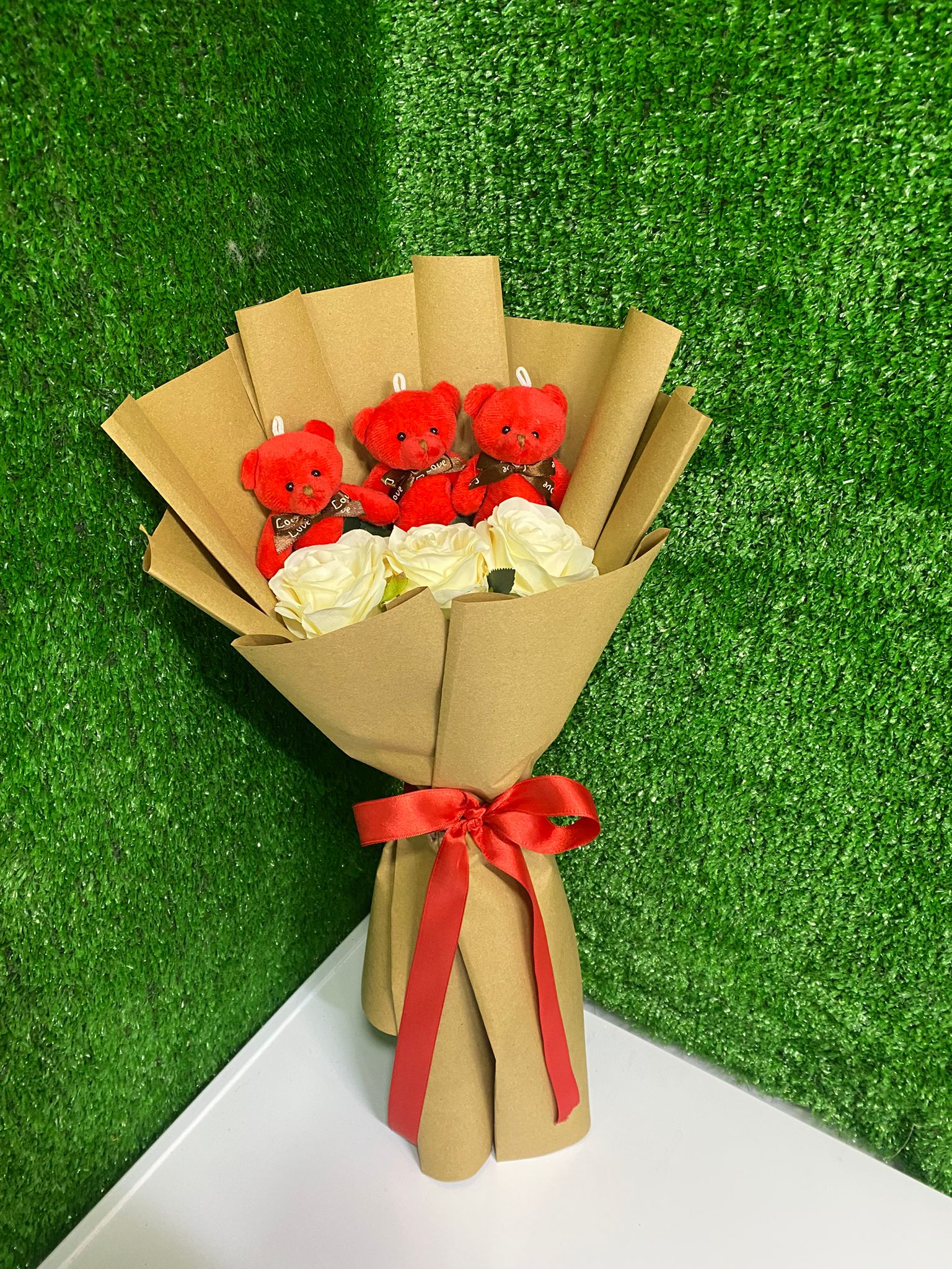 Doğallık ve romantizmi bir araya getiren bu özel tasarım buket; üç adet kırmızı peluş ayıcık, beyaz yapay güller ve şık kraft ambalaj ile hazırlanmıştır. Kırmızı saten kurdele detayı sayesinde zarif ve göz alıcı bir görünüm sunar.