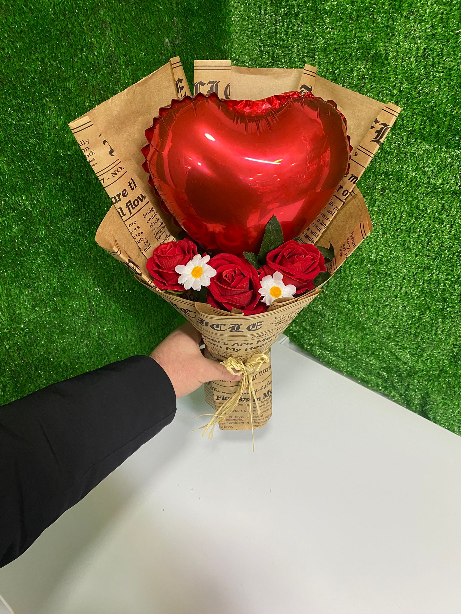 Vintage Aşk Kalp Buketi; kırmızı kalp balonunun romantik parıltısını, kırmızı güllerin klasik zarafeti ve papatyaların masum enerjisiyle buluşturan özel bir tasarımdır.
